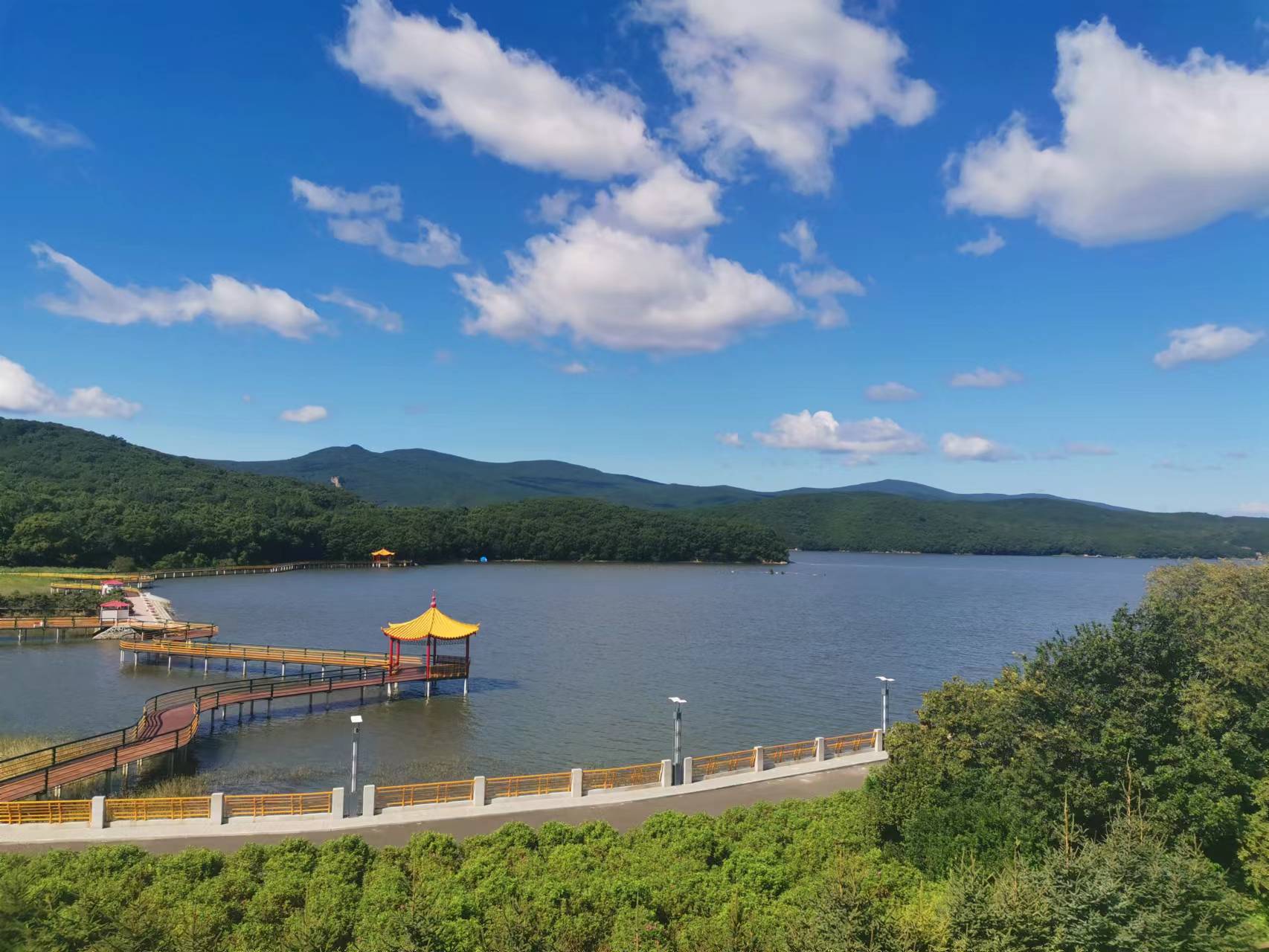 本次旅游地點選在鏡泊湖鹿苑島,小島兩側臨湖,青山綠水,自然風景美不勝收。房間依湖而建,臨窗外觀,山水相融,滿是自然的氣息,讓人忘卻煩憂。
